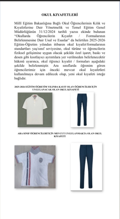 Yapılan değişiklik doğrultusunda okul kıyafetlerimiz beyaz yakalı t-shirt ve lacivert pantolon şeklinde olacaktır.